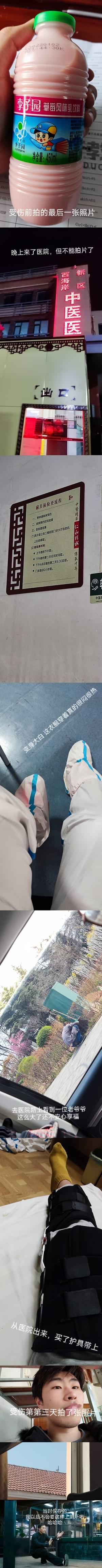 可能有人会觉得我很矫情,哎呀不就是伤个腿吗,也许未来有一天我也会觉得我当时很矫情,但现在回想起来,家人们,只有寥寥数字:痛,太痛了,苦,太苦了。(希望你们永远没有这个机会去体会)你想想别人都在努力做考试前的冲刺,你却只能把这时间花费在一些毫不相干的事上,而且不得不做。你或许永远想象不到一顿要吃一大把药,而且你对这药过敏,吃完没多久就要拉肚子,一连跑好几次厕所,一天肚子除了刚吃完饭那会,几乎就是空的,就这样连续了两个多周。宿舍里就住了我一人,也比较冷清,加上被子比较薄,当时的凌晨还尚能感觉到冬天的余威,所以早上经常被冻醒。晚上睡觉时只能平躺,不能侧身、不能弯腿,就用这一个姿势,我睡了一个月。然后你能想象一个月不怎么说话吗,有的时候一天也说不过几句话,有段时间感觉自己真的快抑郁了(可能是 emo 吧),晚上难过到会掉眼泪,真的想不开,想想感觉自己现在活的真窝囊,这么大了还不能为父母做点啥,还天天让他们操心。到了白天还要继续装出我没事,问题不大的样子,骗别人骗自己。我之前真的都不理解崩溃二字到底是种什么样的情绪,只知道怎么怎么写,考试前的这一个月,我是真领悟到了。比起肉体上的,我感觉这一个多月就是对我心灵上的一次折磨,我就是越不过这道心墙。有时难受到极点的时候你会发现你是不会哭的,你会像发呆一样,连呼吸都特别特别轻微,就像没有一样,直到你的心房一颤,才能将你拉回现实。很长的一段时间,我每天都浑浑噩噩的,脾气也变得暴躁,感觉自己一无是处,觉得这世界的缤纷多彩并不由我,也并不为我。
