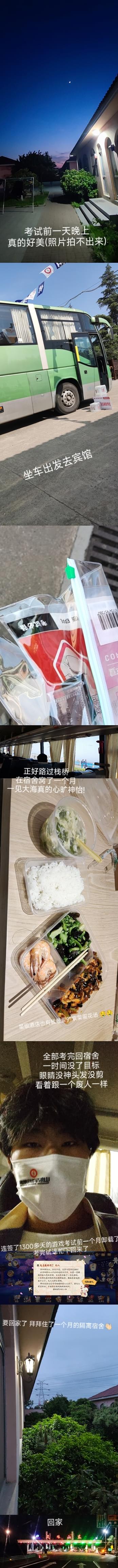 我原本以为考完试之后我会大哭一场,哭出我这几天所有的痛苦和不满,哭我终于熬出头来了,哭我盼来的日子终于来了,但我好像并没有,我现在也记不太清回宿舍的路上我当时脑海在想什么,考完试之后我十分平静,与其说是平静,好像更应该说是麻木,我不知道该为考完试能回家了而欣喜若狂,还是该因为带着这伤回家而感到痛苦万分,悲愁垂涕。就这样当晚回到了家,那晚本来想睡个好觉,但没想到第二天醒的还是比闹钟都早……